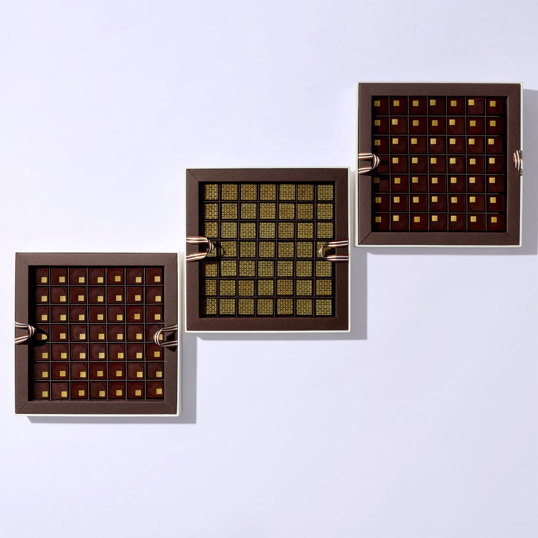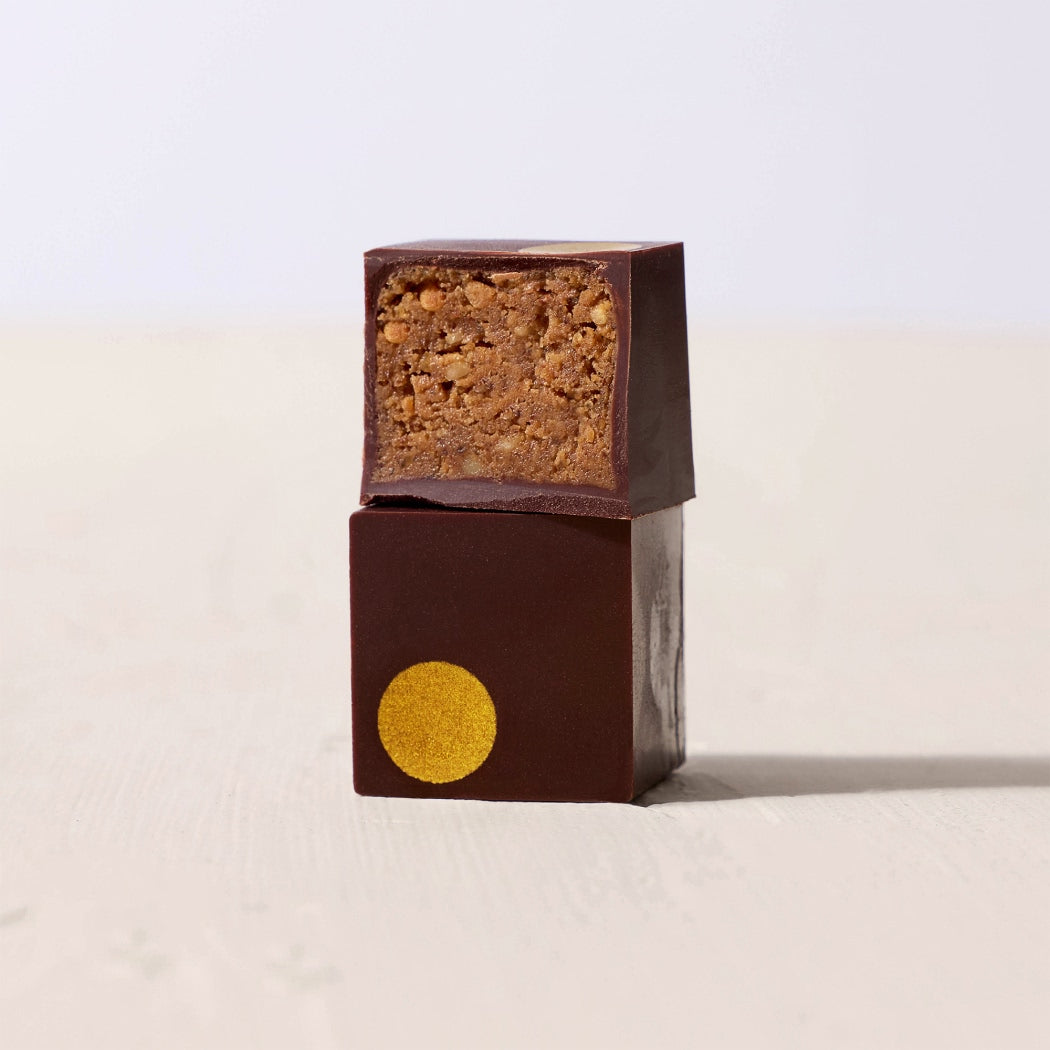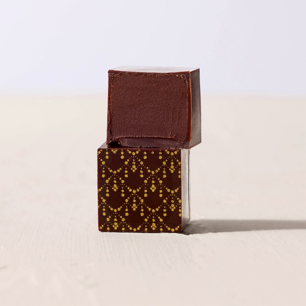 Velvety ganache of 70% Tumaco, Colombia chocolate and fresh cream, featuring notes of dulce de leche, chocolate wafer, and almond, encased in a thin Tumaco, Colombia chocolate shell