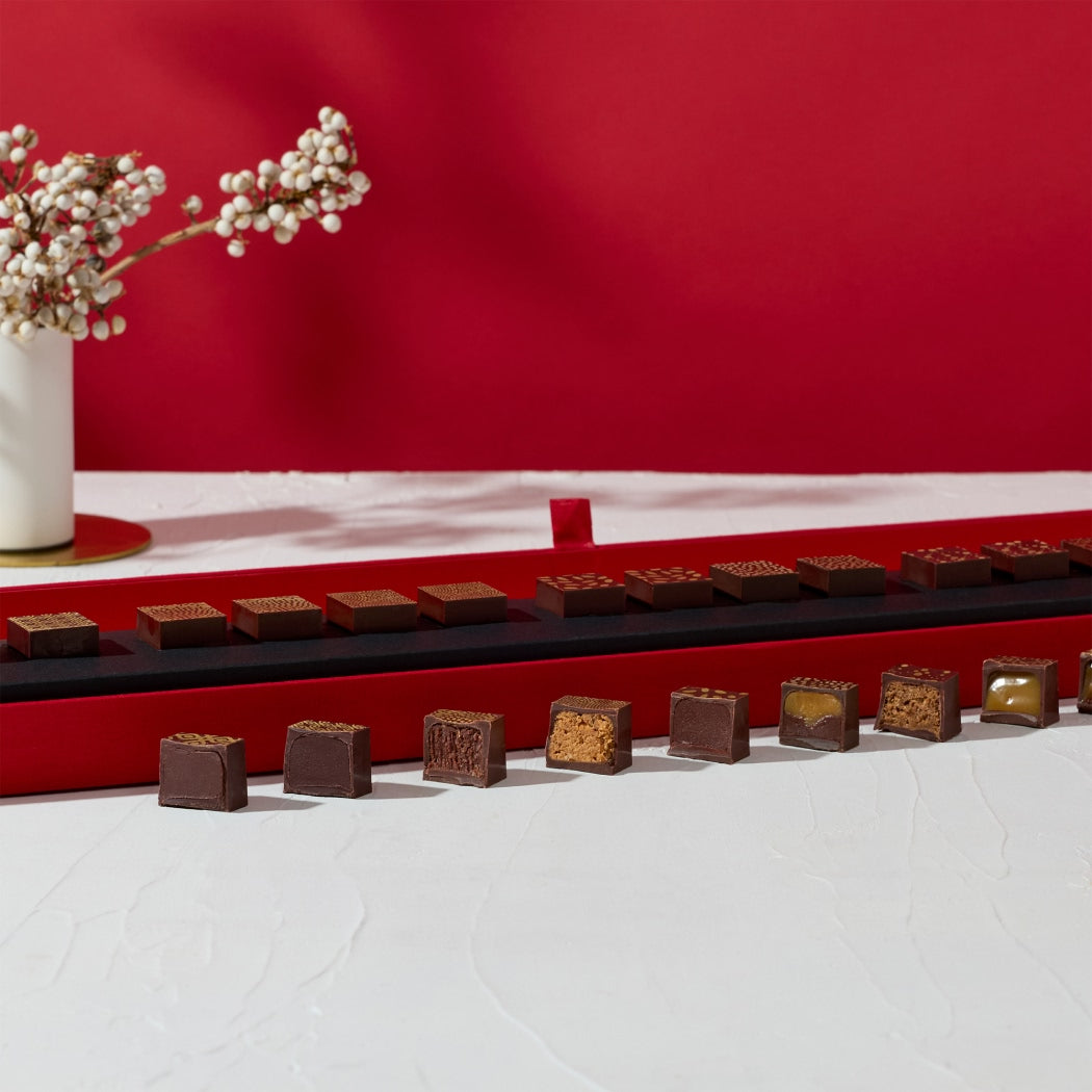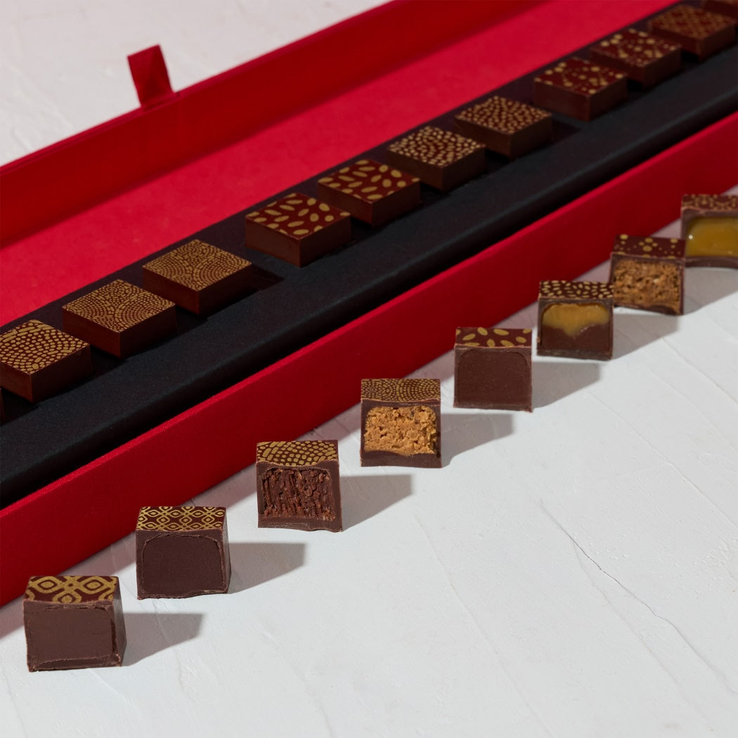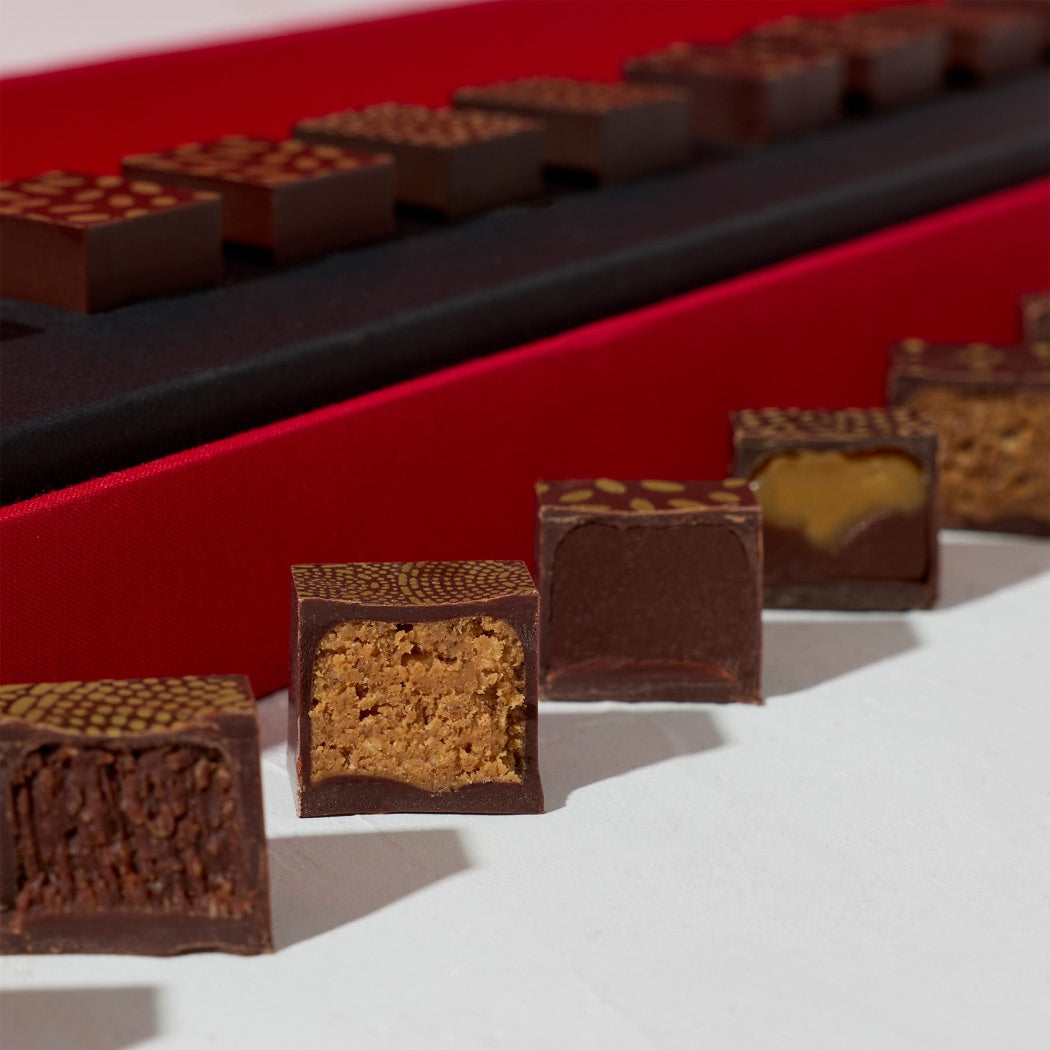 70% chocolate (cocoa beans from Kokoa Kamili, Tanzania; Ambanja, Madagascar; Maya Mountain, Belize; Tumaco, Colombia; Costa Esmeraldas, Ecuador; organic cane sugar), 100% chocolate (cocoa beans from Camino Verde, Ecuador), 70% House Blend chocolate (cocoa beans, organic cane sugar), organic cane sugar, organic butter, organic cocoa butter (cocoa beans from Camino Verde, Ecuador), soursop, hazelnuts, organic heavy cream, glucose syrup, Marcona almonds, espresso beans, honey, quicos (corn, canola oil, sea salt), Spanish peanuts, invert sugar, feuilletine (wheat flour, sugar, butter, milk sugar, milk proteins, salt, malt extract [barley], baking soda), passion fruit, coconut puree, toasted coconut, banana, fraises de bois (wild strawberries), Hachiya persimmon, vanilla bean, honey, organic whole-milk powder, sorbitol powder, trimoline, gin, lime juice, peanut oil, fleur de sel, pectin, water, gelatine, piment d’espelette, allspice, salt, voatsipfery pepper
