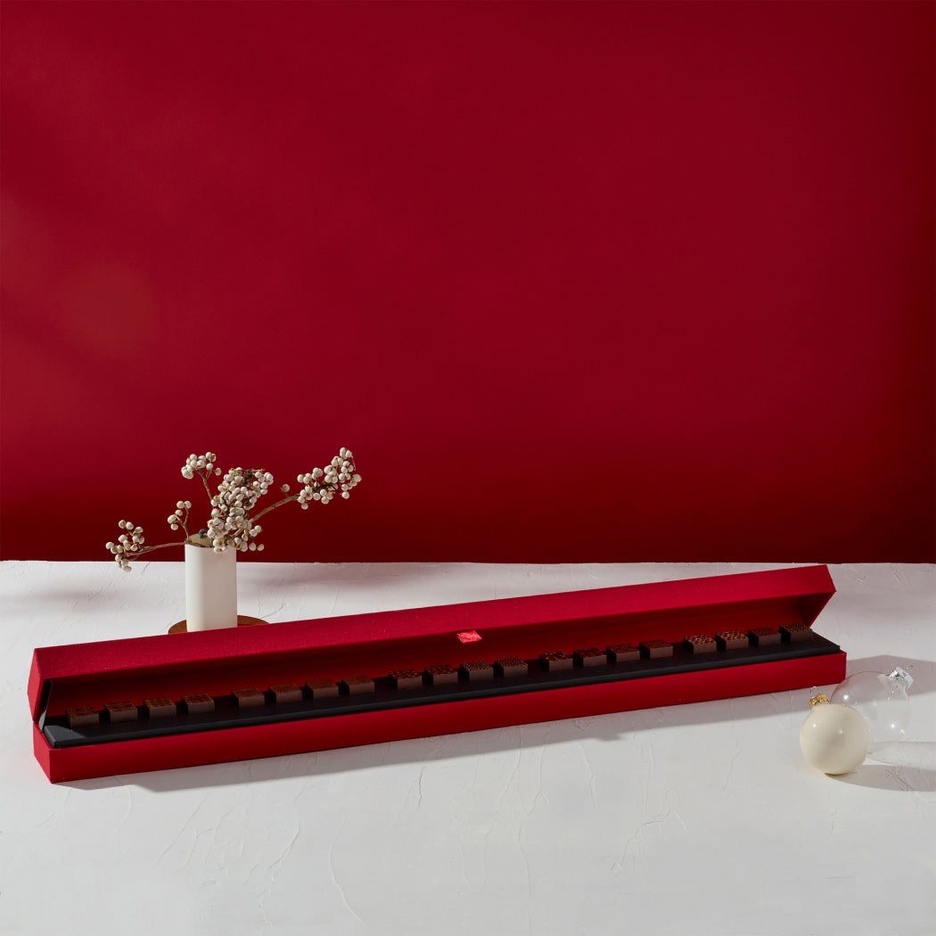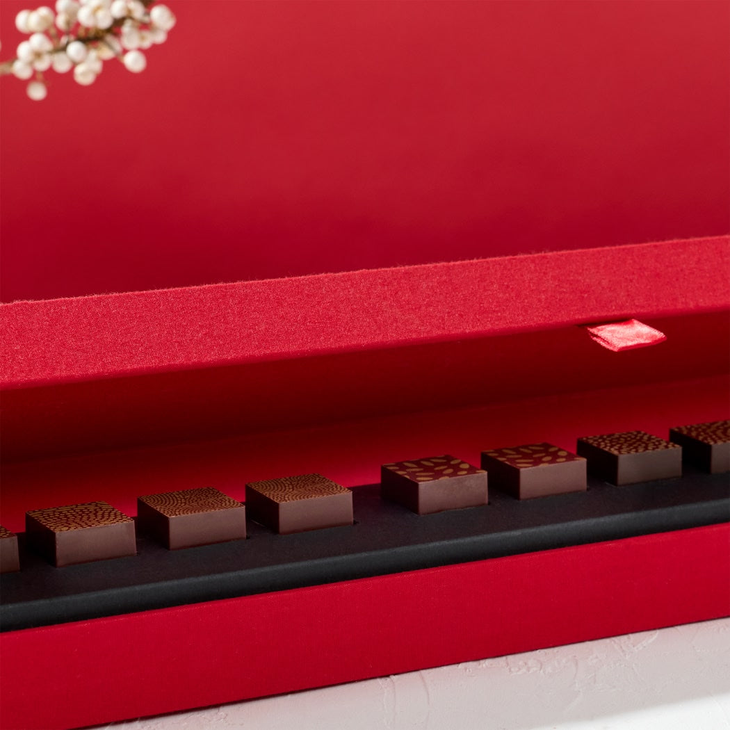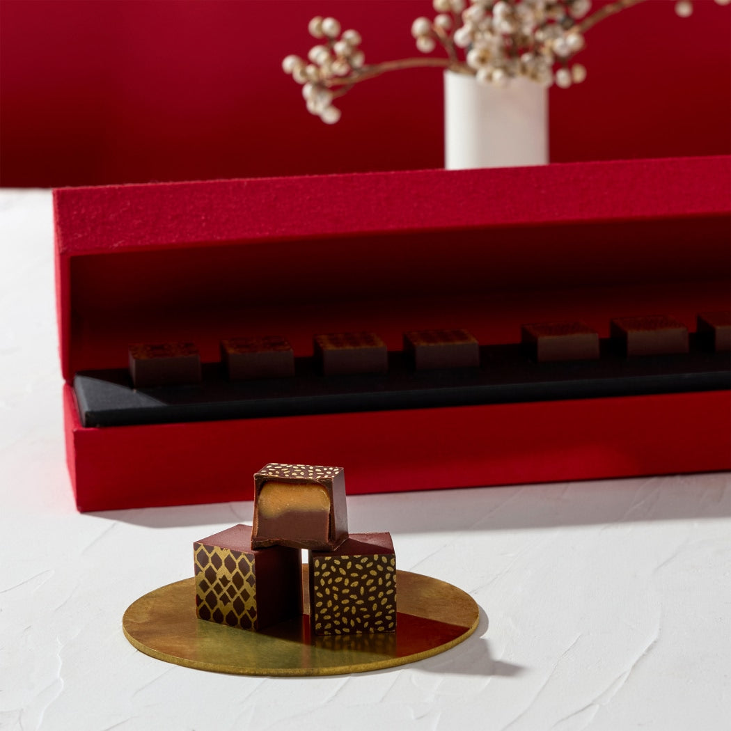 70% chocolate (cocoa beans from Kokoa Kamili, Tanzania; Ambanja, Madagascar; Maya Mountain, Belize; Tumaco, Colombia; Costa Esmeraldas, Ecuador; organic cane sugar), 100% chocolate (cocoa beans from Camino Verde, Ecuador), 70% House Blend chocolate (cocoa beans, organic cane sugar), organic cane sugar, organic butter, organic cocoa butter (cocoa beans from Camino Verde, Ecuador), soursop, hazelnuts, organic heavy cream, glucose syrup, Marcona almonds, espresso beans, honey, quicos (corn, canola oil, sea salt), Spanish peanuts, invert sugar, feuilletine (wheat flour, sugar, butter, milk sugar, milk proteins, salt, malt extract [barley], baking soda), passion fruit, coconut puree, toasted coconut, banana, fraises de bois (wild strawberries), Hachiya persimmon, vanilla bean, honey, organic whole-milk powder, sorbitol powder, trimoline, gin, lime juice, peanut oil, fleur de sel, pectin, water, gelatine, piment d’espelette, allspice, salt, voatsipfery pepper