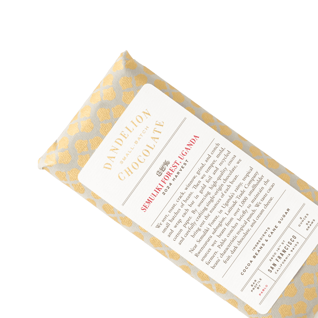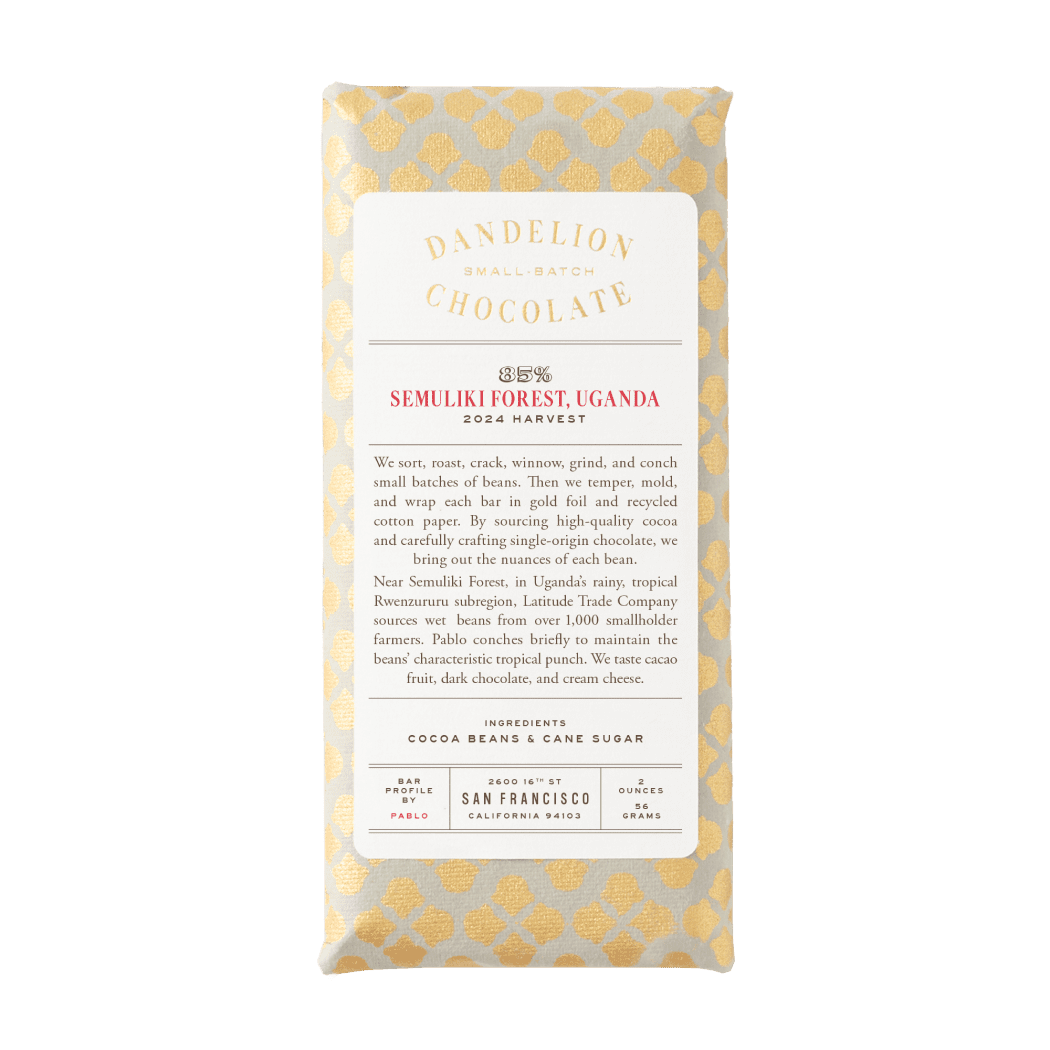 Near the town of Bundibugyo in western Uganda, Semuliki Forest cocoa is grown by roughly 1,000 organically certified regional farmers, of whom 52 percent are women. Fermentation varies from five to six days, and beans are sun-dried on portable raised decks for six to seven days, and then blended to create consistent lots of delicious beans before export.