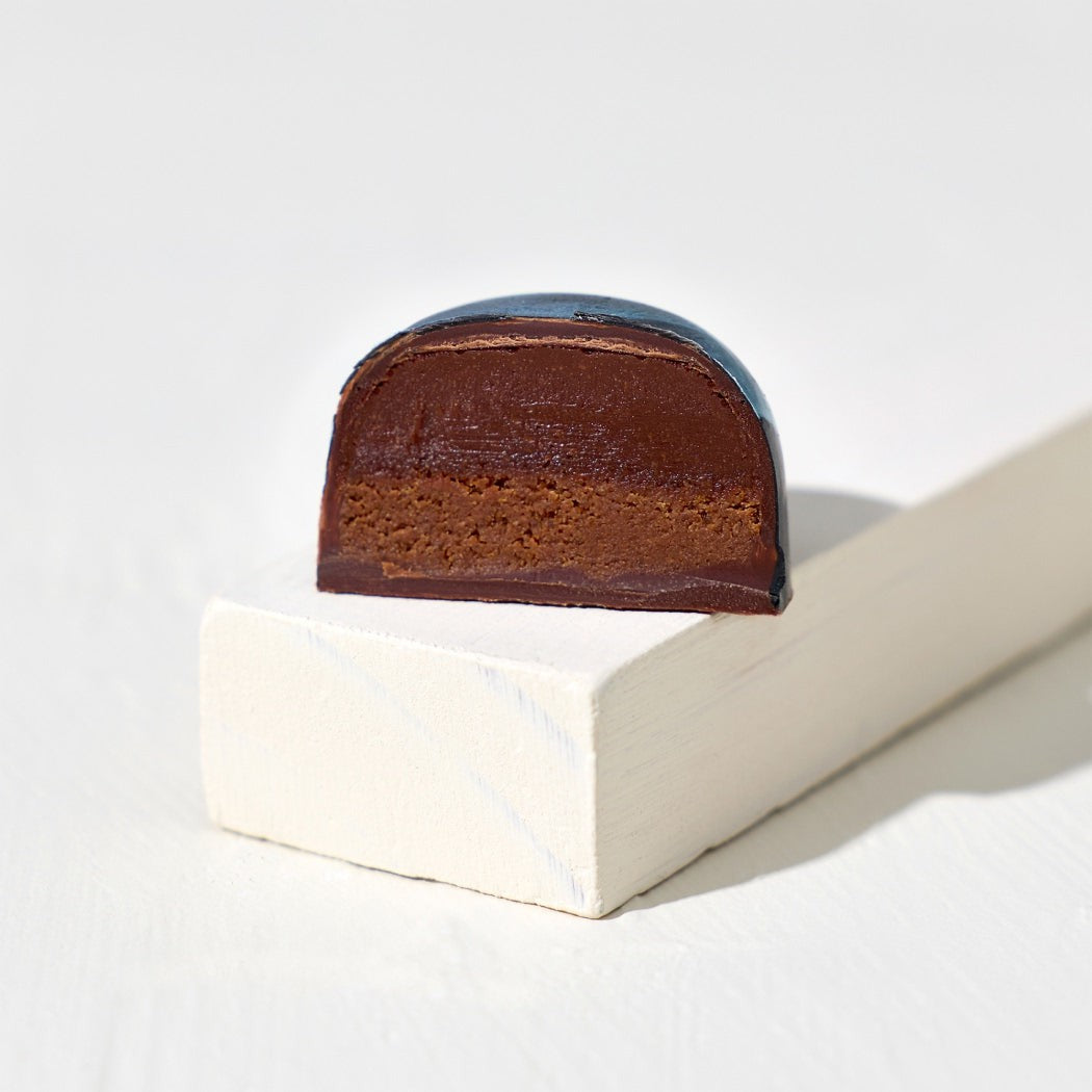 Dandelion 70% chocolate (cocoa beans from Tumaco, Colombia, organic cane sugar), heavy cream, cookie butter (cookies [wheat flour, sugar, vegetable oils [contains one or more of soybean oil, sunflower oil, canola oil, palm oil], brown-sugar syrup, sodium bicarbonate, soy flour, salt, cinnamon], canola oil, sugar, soy lecithin, citric acid), gingerbread cookies (wheat flour, molasses, brown sugar, butter, eggs, baking soda, salt, ginger, cinnamon, cloves), white chocolate (sugar, cocoa butter, whole-milk powder, sunflower lecithin, vanilla extract), cocoa butter, invert sugar, butter, fresh ginger, molasses, glucose, cinnamon sticks, ground ginger, cloves, natural cocoa butter coloring (ultra-refined organic cocoa butter [non-deodorized, kosher], natural colors)